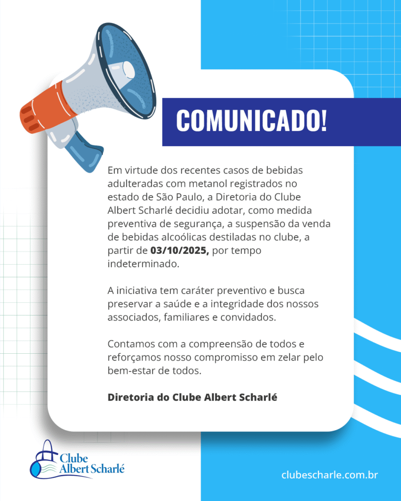 Heart Jki-star-1-light Share-alt 📢 Comunicado importante – sobre vendas de bebidas alcoólicas agencialogan 3 de outubro de 2025 Comunicado 📢 Comunicado importante aos nossos associados Em virtude dos recentes casos de bebidas adulteradas com metanol registrados no estado de São Paulo, a Diretoria do Clube Albert Scharlé decidiu adotar, como medida preventiva de segurança, a […]