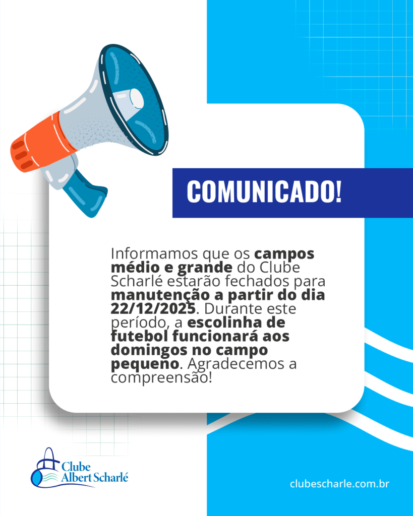 Heart Jki-star-1-light Share-alt agencialogan 23 de dezembro de 2025 Comunicado Comunicado Oficial: Clube Fechado em 15 e 16 de Dezembro ⚽ Atenção, sócios: Os campos médio e grande estarão fechados para manutenção a partir de 22/12/2025. 🔧 Melhorias em andamento para você aproveitar ainda mais! 📍 Escolinha de futebol: apenas aos domingos no campo pequeno […]