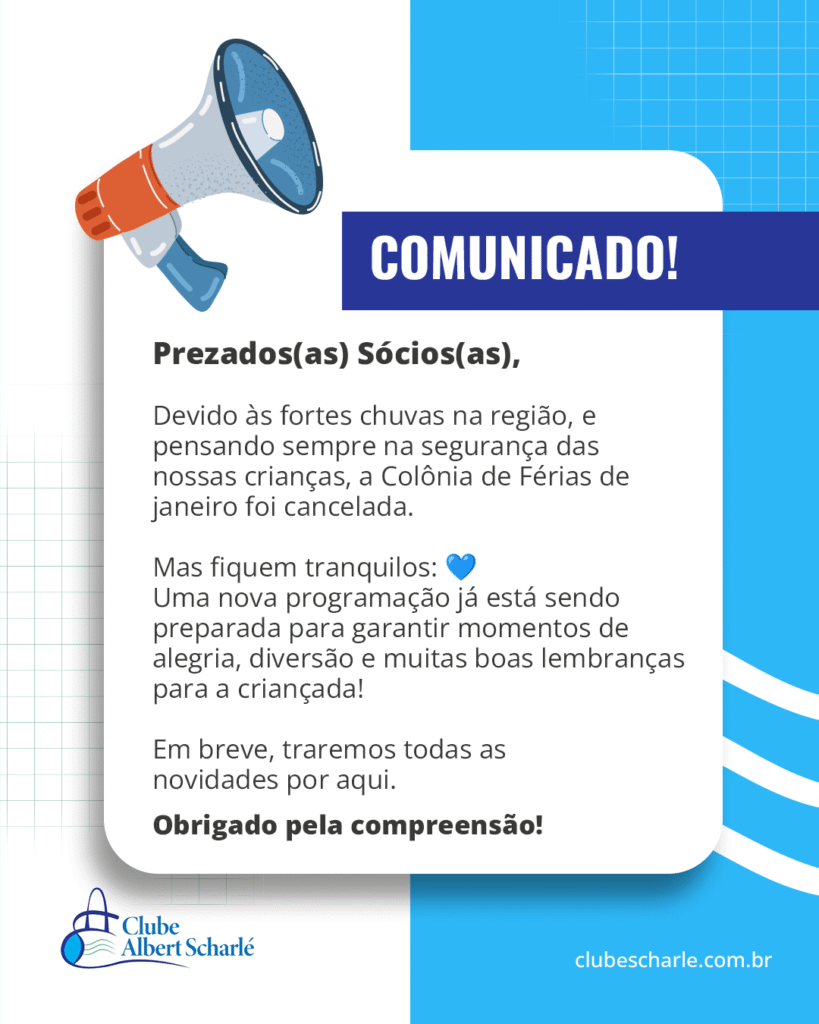 Heart Jki-star-1-light Share-alt Clube Albert Scharlé 23 de janeiro de 2026 Comunicado COMUNICADO OFICIAL Prezados(as) Sócios(as), Em razão das fortes chuvas registradas na região e visando, acima de tudo, a segurança e o bem-estar das crianças, informamos que a Colônia de Férias prevista para o mês de janeiro está cancelada. A decisão foi tomada de […]