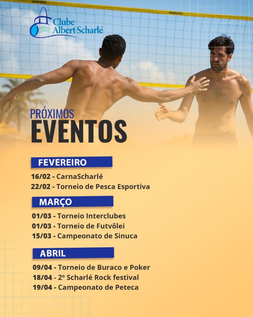 Heart Jki-star-1-light Share-alt Clube Albert Scharlé 12 de fevereiro de 2026 Eventos,Eventos especiais,Notícias 📆 Calendário dos próximos eventos Preparamos uma agenda RECHEADA de eventos incríveis para você e sua família! Do carnaval ao rock, dos esportes aos jogos de mesa – tem opção para todos os gostos! 🏆 📅 FEVEREIRO🎭 16/02 – CarnaScharlé🎣 22/02 – Torneio […]