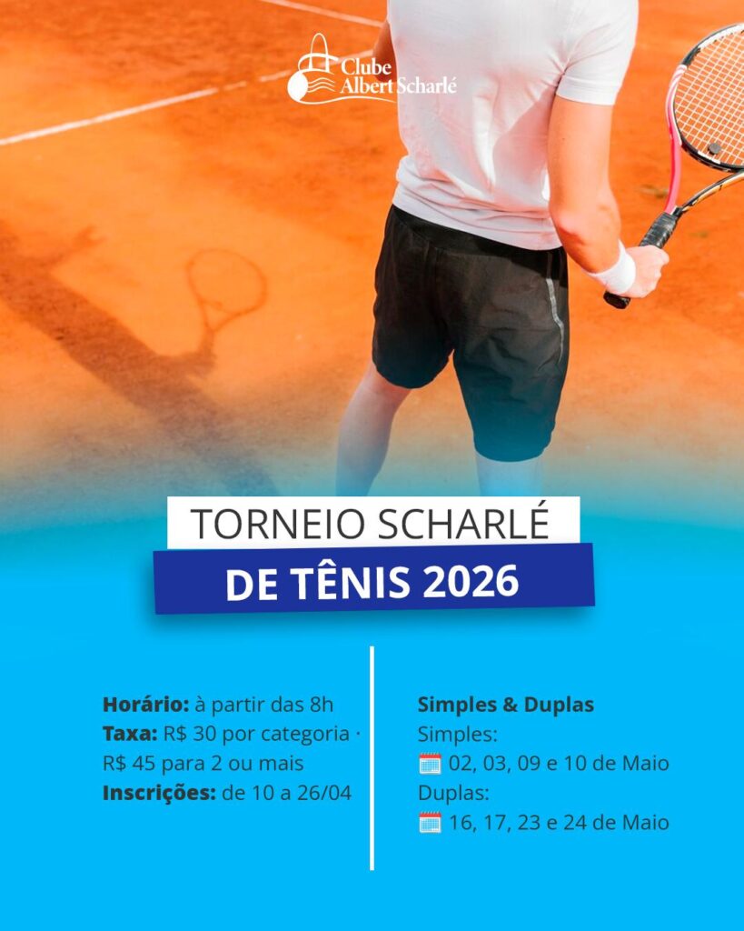 Heart Jki-star-1-light Share-alt Clube Albert Scharlé 1 de abril de 2026 Eventos,Eventos especiais,Notícias Torneio Scharlé Tênis 2026 🎾 Chegou a hora de mostrar o seu jogo. 🎾 O Torneio Scharlé Tênis 2026 está chegando com categorias para todos os níveis — do iniciante ao experiente, no simples e nas duplas. Inscrições abertas de 10 a 26 de […]